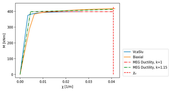 A novel aspect of this study is the challenging nature of maintaining the latter range. As the compressed reinforcement increases, the section’s behavior rapidly switches to range 3. Moreover, there is a divergence in ductility compared with theoretical values. Both reference formulations (see Equations (7) and (8)), based on equilibrium at translation and rotation, exhibit clear differences as μs increases. This research shows that the increase in bending resistance is also evident in the analysis of a reinforced concrete bridge section using the MEG Ductility software, resulting in an ultimate moment 10% larger than that obtained through linear analysis.