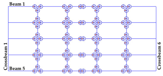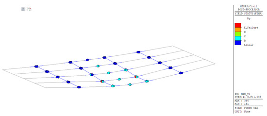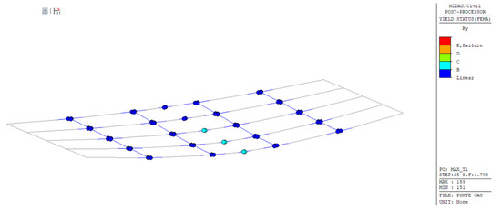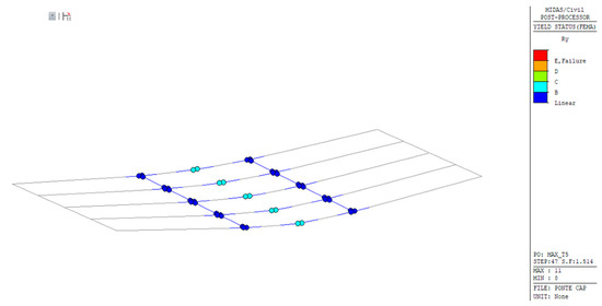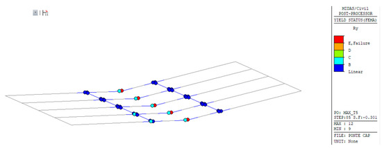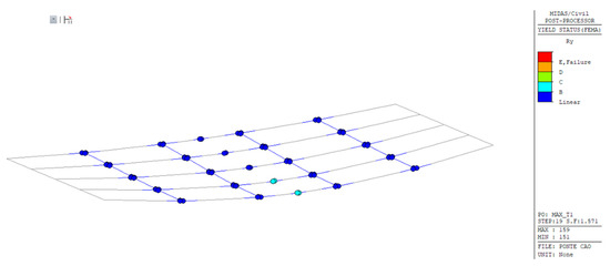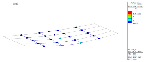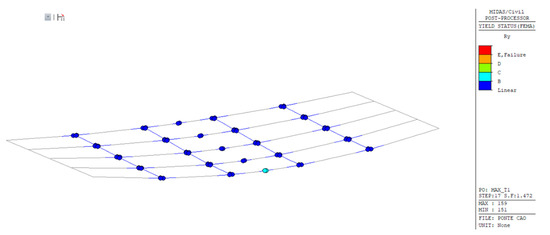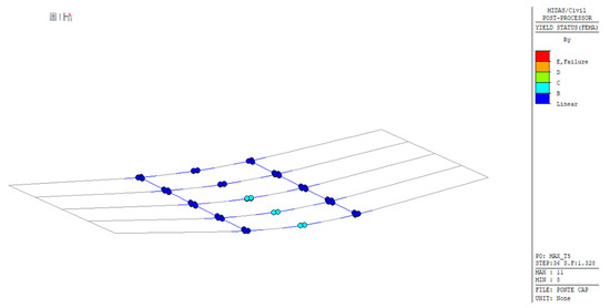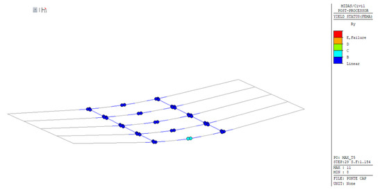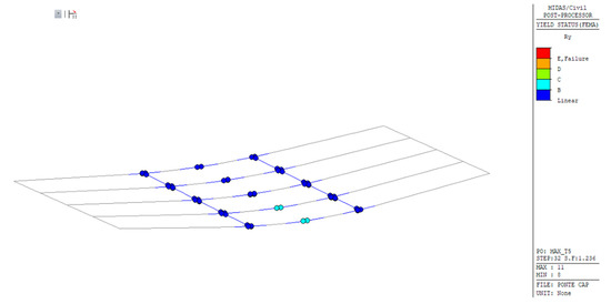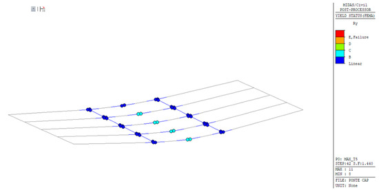 The number of crossbeams has a fundamental importance in the study of the global structural response of the deck. In the case of the PRC viaduct, given the presence of four crossbeams only (of which two are in the span), the behavior is different from that of the RC bridge since, in this case, there is no significant redistribution [56] given from the crossbeams in the plasticization steps, as shown in Figure 69, Figure 70, Figure 71 and Figure 72. This leads to a global collapse of the deck without a local collapse of individual elements [57].
