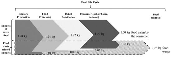 As a result, the emissions related to food waste include all emissions produced during the production (gray), processing (light gray), retailing and distribution (white), and consumption (dark gray) of the wasted food. They also include all emissions from operations and waste disposal (dashed). As a result, this food supply chain starts with the original production of 1.28 kg of apples, of which 0.04 kg is discarded as food waste. Then, 1.24 kg of processed food are put into the system, while 0.02 kg of food waste are taken out. Then, because it is food waste, 0.02 kg of the 1.22 kg supplied is taken away. Finally, 1 kg of apples is consumed by citizens, and a total of 0.28 kg has been wasted along the food chain, meaning that 1.28 kg of apples must be produced for 1 kg of apples to be consumed [].