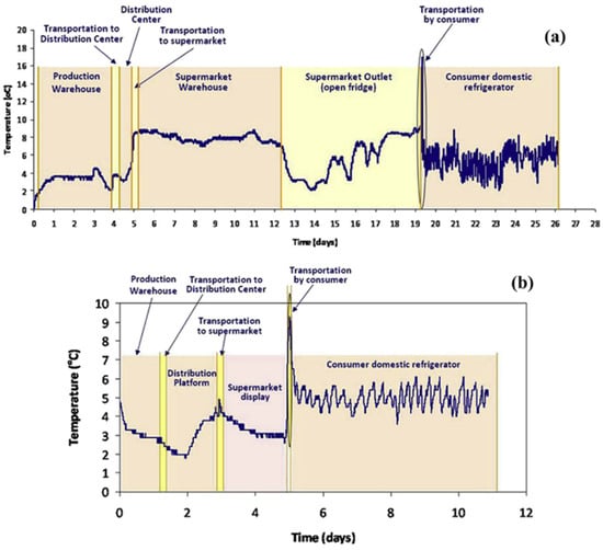 High food quality is very important for the fresh food supply chain because it is the high quality of food that leads to the high market value of the product and customer acceptance, so there is food safety. One of the characteristics of fresh food is that it has a strict time limit before it spoils, and, after that period, the food will quickly lose its value, which can lead to additional losses and expenses, loss of market share, and result in food safety problems []. As a result, low-temperature transport networks, which are now the primary means of carrying fresh food, can better protect food freshness. The temperature has a major impact on food preservation in the low-temperature transport chain because it can lengthen the shelf life of various fruits, vegetables, and other commodities. Low-temperature transport chains are primarily concentrated in medium and large cities due to the limits of economic conditions and various geographic locations, as the requirement for low-temperature transport chains in rural areas is not very large []. Since items are delivered within hours of arrival at the distribution center, managing low-temperature supply chains for new products requires making prompt decisions to increase the shelf life of the freshest products. Logistics for low-temperature supply chains must, therefore, be always monitored and controlled automatically. However, ground transportation is an expensive option for the businesses that deliver and pick up the goods and has a detrimental effect on the environment because of CO2 emissions. For instance, delivering fresh or frozen groceries, medicines, and flowers results in higher emissions since more fuel is required to maintain the temperature of the trucks. Refrigerant leaks are also linked to increased emissions. Temperature control during storage might potentially result in extra expenses and emissions []. Fresh foods also need to be kept at a controlled temperature to maintain high quality and ensure longer shelf life [,,]. Indeed, to prevent losses along the transport chain at low temperatures, Gogou et al. [] developed a study to investigate temperature variations as shown in Figure 2. In this case, it was considered for the transport of meat in two countries (Greece and France) along the chain. The field test was performed by inserting one data logger per food package invisible to people involved in the supply chain and the consumer. Currently, there are technological sensory solutions based on wireless communications that allow for monitoring the temperature and humidity of the conservation environment or of the food products as well as other items [,], suitable for real-time traceability [,].