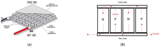 (a) Structure of the Peltier cell []; (b) representation of Peltier cell operation.