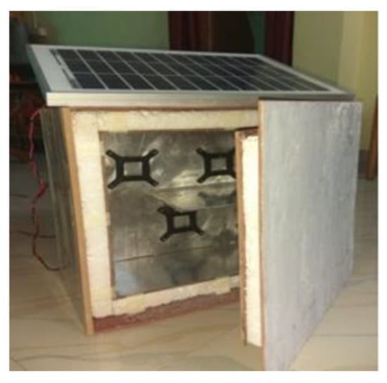 It should be noted that Peltier cells are solid devices with no moving parts, and are completely silent, extremely reliable, small, lightweight, and maintenance-free, has a wide temperature range, and are environmentally friendly. However, if Peltier cells consume too much power and a failure occurs, this can destroy the cold side, because when negative temperatures are reached, condensation can occur, depending on the environment and the humidity of the air. If the heat generated cannot be dissipated to the environment, it will be dissipated to the cell itself, bringing the system into thermal equilibrium and drastically reducing the life of the cell. In certain designs, it is possible to find “stacked” cells that converge their heat-dissipating sides with the absorbing side of another cell, thus increasing the cooling power in the first cell. Due to all the characteristics of Peltier cells, there are several applications for which they are useful: Badalan and Svasta [] present the comparison between the operation of an LED with a Peltier cell and an LED using a normal heat sink; Halima et al. [] studied the effect of adding a Peltier cell to the heat sink of an LED; Lu et al. [] used a Peltier cell to stabilize the junction temperature of a high-power LED; Iskrenović et al. [] built a thermostat that provides faster and more accurate measurements and runs without oscillation during temperature adjustment; Diatta et al. [] investigated the influence of the Peltier cell effect on the evolution of grain size heterogeneity, density, and temperature during boron carbonate spark plasma sintering agglomeration (SPS); Freire et al. [] tested the extraction of energy from Peltier-cell-based thermoelectric generators by natural and/or artificial heat sources, providing a new environmentally friendly tool for clean energy generation; Abraham James et al. [] proposed and developed a portable device for the storage and disinfection of masks; Casano and Piva [] performed a quantitative evaluation of cooling system performance for removing the heat produced by the electronic devices’ active and passive components and SMPS for limiting its maximum temperature operation; Casano and Piva [] conducted an experimental study to determine the performance of thermoelectric modules across various ohmic loads; Ivanov et al. [] studied and applied a new way to reduce heat losses by using power cables equipped with Peltier cells; Guráš and Mahdal [] created a testing apparatus to evaluate the usage of Peltier cells in a heat exchanger and a liquid intermediate circuit for liquid cooling; Guráš et al. [] used geophysical fluid dynamics (GFD) to simulate the internal heat exchanger heat transfer of a unique liquid chilling device that combines a two-circuit liquid refrigeration system featuring a Peltier-module-based new chilling core and an accumulator; Jahangir et al. [] proposed a fresh design for a jacket that cools using the Peltier effect; Siddique et al. [] presents a thermoelectric Peltier-module-based cooler augmented with phase change material (PCM) for storage and refrigeration applications in the food business; and Shi et al. [] studied the cooling drinking water cost using the conventional specific exergy costing (SPECO) hypothesis. An attempt was made to construct a prototype instant drinking water cooler utilizing Peltier modules; Corpuz et al. [] created a food delivery storage system with built-in artificial heating and cooling to prevent the temperature of the food from rising too quickly during delivery. However, the applications found most interesting for this research were from Kalimuthu et al. [] and Rokde et al. []. Kalimuthu et al. [] have created a sophisticated, mobile refrigerator that may be utilized to transport medications and food to the desired area. By enabling the user to choose the desired target temperature at which the entire refrigeration unit must work, this gadget offers greater efficiency than the current refrigerator. On the other hand, Rokde et al. [] developed a solar-powered refrigerator for use in rural areas, which proved to be more reliable than portable refrigerators and more cost-effective and environmentally friendly, which is the current requirement most desired by society. The developed refrigerator has internal dimensions of 30 × 30 × 14 cm3 with an average wall thickness of 4 mm of fiberboard, thus having a capacity of 12.5 L, as shown in Figure 4. Thus, by controlling the temperature range of the refrigeration unit, this refrigerator can be used in various sectors, such as the preservation of dairy products, fish, and seafood transported to markets, or even the transport and storage of blood and pharmaceutical products. For example, this refrigerator started at a temperature of 32 °C and proved to have an efficiency of up to 7 h, and the temperature it managed to reach after 5 h was 14 °C. However, the efficiency can increase by raising the number of Peltier cells used to reach even lower temperatures.