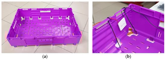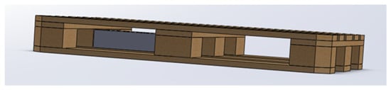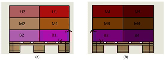Starting with the battery, its positioning should be in a place where there is minimal loss of usable space for placing the secondary packaging. For this reason, it was determined that the battery, with the maximum dimensions mentioned above, could be placed at the bottom of the euro pallet, as shown in Figure 8. It is protected on both sides by two metal plates with maximum dimensions of 500 × 78 × 5 mm3 so that the forks of the forklifts do not damage the batteries.