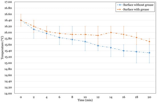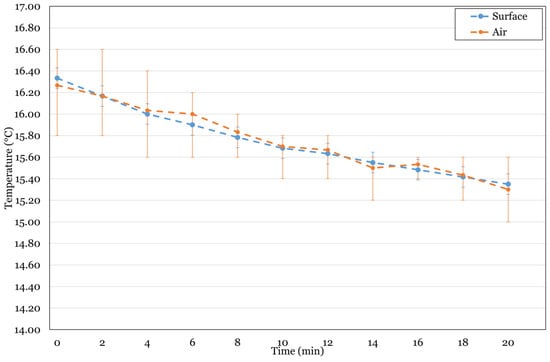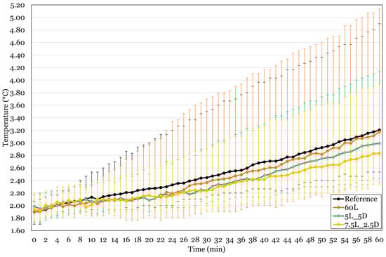 Thus, the analysis of the linear trend lines of both curves shows that the slope decreased from 0.0104 °C/h (reference test) to 0.0067 °C/h (7.5L_2.5D test), a decrease of approximately 35.6%. The standard deviation of the temperature of both curves shows an identical behavior in both tests until the 9th minute, with an alternation between the maximum and minimum values. However, from the 10th minute, there is an absolute predominance of the reference test concerning the 7.5L_2.5D test, resulting in a difference between the maximum and minimum temperatures of both tests of 0.2 °C for both temperatures.