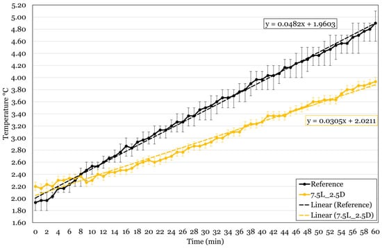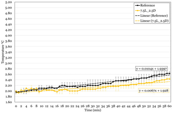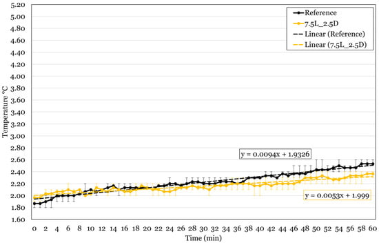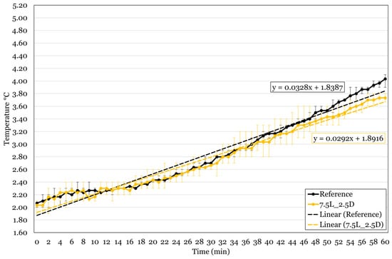 Analysis of the trend lines for both curves show a decrease in slope from 0.0094 °C/h (reference test) to a slope of 0.0053 °C/h (7.5L_2.5D test), a decrease of 43.6%. The analysis of the standard deviation of both curves shows that, as in the characteristic curve, there is an identical behavior in both tests, with an alternation of maximum and minimum values. However, from minute 38, the reference test is predominant concerning the 7.5L_2.5D test, which translates into a difference between the maximum and minimum temperatures between the two tests of 0.2 °C for the temperatures.