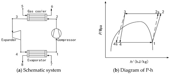 The schematic and pressure–enthalpy diagrams of the TCEX are depicted in Figure 1a,b, respectively. The system is mainly composed of a compressor, gas cooler, expander, and evaporator. The working process is as follows: the high-temperature and high-pressure CO2 gas discharged via the compressor enters the gas cooler isobaric cooling; Then, the CO2 working medium discharged via the gas cooler expands and depressurizes via the expander and recovers the expansion work; Subsequently, CO2 liquid enters the evaporator to absorb heat to a saturated gas state; Finally, the saturated CO2 gas enters the compressor to compress to the high-temperature and high-pressure state, and thus, a cycle is completed.