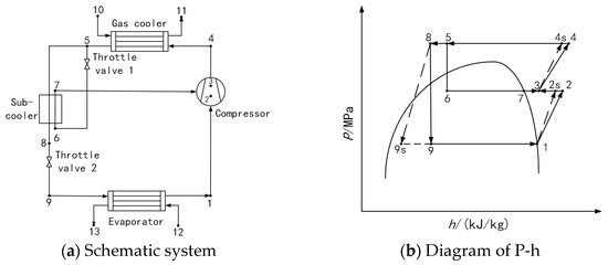 The schematic and pressure–enthalpy diagrams of the TCI are depicted in Figure 3a,b, respectively, and the system is mainly composed of a vapor injection compressor, a gas cooler, an evaporator, a gas–liquid separator, a subcooler, and a throttle valve. The working process is as follows: the high-temperature and high-pressure CO2 gas discharged via the compressor enters the gas cooler isobaric cooling; Then, the CO2 working medium is divided into two strands; One is cooled by throttle valve 1 and enters the compressor as a supplementary gas after absorbing heat via the subcooler; The other stream is further cooled by the subcooler and enters the evaporator to absorb heat; The saturated gaseous CO2 discharged via evaporator enters the compressor, mixes with the supplementary gas after the first stage of compression, and then discharges the compressor after the secondary compression to a high temperature and high pressure, and thus, a cycle is completed.