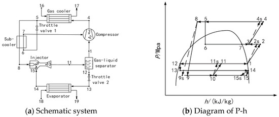 The schematic and pressure–enthalpy diagrams of the TCIEJ are shown in Figure 4a,b, respectively, and the system is mainly composed of a vapor injection compressor, gas cooler, ejector, evaporator, gas–liquid separator, subcooler, and two throttle valves. The working process is as follows: the high temperature and high pressure CO2 gas discharged via the compressor enters the gas cooler isobaric cooling and heat release, and then the CO2 working medium is divided into two strands; A stream is cooled down by throttle valve 1 and enters the compressor as a supplementary gas after absorbing heat via the subcooler; The other stream is further cooled by the subcooler and then enters the ejector as an induced fluid, mixes and expands with the induced fluid from the evaporator in the ejector, and then enters the gas–liquid separator for gas–liquid separation; The separated saturated CO2 liquid passes through throttle valve 2 and undergoes throttling and depressurization, and then enters the evaporator to absorb heat to a saturated gaseous state; The saturated gaseous CO2 discharged via the evaporator enters the ejector as the induced fluid; The separated saturated CO2 gas enters the compressor, mixes with the vapor injection gas after the first stage of compression, and then discharges the compressor after the second stage compression to a high temperature and high pressure, and thus, a cycle is completed.