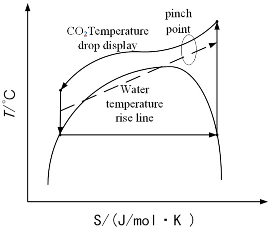 Since the specific heat of CO2 changes nonlinearly, there is a point in the gas cooler where the heat transfer temperature difference between cooling water and CO2 is the smallest, called the pinch point [19], as shown in Figure 5. If a complex model based on the structural parameters of the heat exchanger is introduced, it will be difficult to ensure the rationality and versatility of the model [20]. Therefore, the temperature difference in the pinch point is used as a known condition to build the model. There are also heat exchange pinch points in evaporators and subcoolers, which are generally fixed at the inlet or outlet. In practical applications, the ambient temperature and cooling water inlet and outlet temperatures have a great influence on the system’s performance. Therefore, a thermodynamic model must be established based on the heat transfer pinch point to study the influence of external conditions such as cooling water inlet and outlet temperatures and ambient temperature.