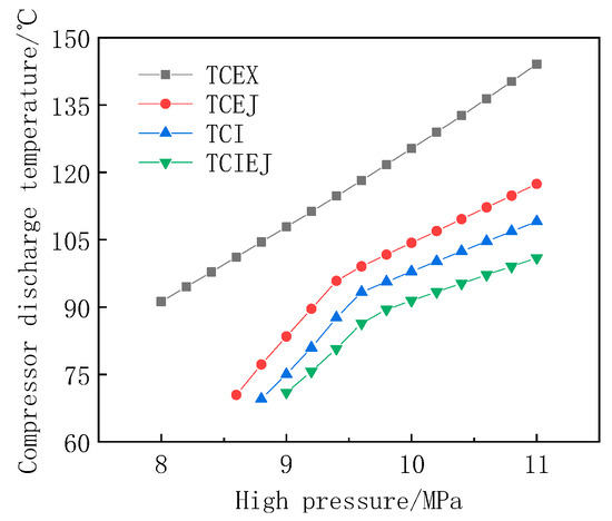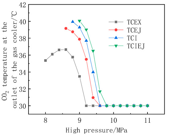 Figure 8 shows the trend of compressor discharge temperature as a function of high pressure for the four cycles. With the increase in high pressure, the exhaust temperature of the compressor in all four cycles increases rapidly. TCEX has the highest compressor exhaust temperature, and the exhaust temperature of TCEJ and TCI are significantly reduced, which indicates that the introduction of ejectors or the use of vapor injection technology can effectively reduce the compressor exhaust temperature. TCIEJ further introduces an ejector based on the TCI, so the exhaust temperature is the lowest. And the exhaust temperature can be controlled at 100 °C even if the high pressure reaches 11.0 MPa. The minimum high pressures of TCEJ, TCI, and TCIEJ that can operate normally are about 8.6 MPa, 8.8 MPa, and 8.9 MPa. When considering the cooling water inlet and outlet temperatures, the high pressure is lower than the respective minimum value, the compressor exhaust temperature drops to about 65 °C. Limiting the pinch point temperature, the outlet temperature of the cooling water will not reach 60 °C, so TCEJ, TCI, and TCIEJ have their own minimum operating high pressure.