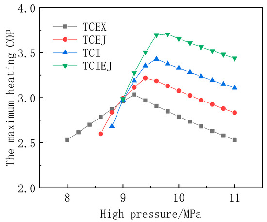 Figure 9 shows the trend of the heating COP of four cycles with high pressure. With the increase in high pressure, the heating COP of the four cycles first increases rapidly, reaches their respective peaks, and then begins to decrease. There is an optimal high pressure that makes heating COP reach the maximum. This is consistent with the trend of Bai’s study [16,17], and the COP value under the same working conditions is also basically consistent. When the high pressure is lower than the critical high pressure, with the increase in high pressure, the compressor exhaust temperature increases, and the CO2 temperature at the outlet of the gas cooler decreases, so the heat release of CO2 in the gas cooler increases. And the compressor pressure ratio increases, the compressor isotropy efficiency decreases, and the compressor power consumption increases. At this time, the increment of heat generation is greater than the increment of compressor power consumption, so the system heating COP will increase rapidly. After reaching the critical high pressure, with the increase in high pressure, the heating CO2 temperature at the outlet of the gas cooler is kept unchanged at 30 °C, resulting in an increase in heat production that is less than the increase in the power consumption of the compressor, so the system heating COP begins to gradually decrease.
