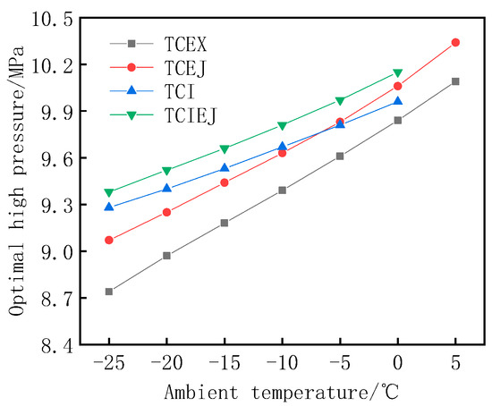 When the ambient temperature is −25 °C, the optimal high pressure of TCIEJ is 9.38 MPa, which is 7.3% higher than that of TCEX of 8.74 MPa. The optimal high pressures of TCEJ and TCI at an ambient temperature of −25 °C are 9.07 MPa and 9.28 MPa, respectively, which are 3.8% and 6.2% higher than TCEX. As the ambient temperature gradually increases, the optimal high pressure of TCEX and TCEJ rises faster than that of TCI and TCIEJ, and when the ambient temperature reaches −5 °C, the optimal high pressure of TCEJ gradually exceeds TCI.