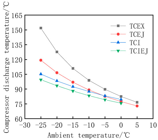 Figure 11 shows the trend of compressor discharge temperature as a function of ambient temperature when the system is operating at the optimal high pressure corresponding to each ambient temperature. The compressor exhaust temperature of all four systems decreases as the ambient temperature increases. And this is consistent with the trend of Li’s study, and the values are basically consistent. Among them, TCEX has the highest compressor exhaust temperature; when the ambient temperature is −25 °C, the exhaust temperature is as high as 150 °C. Due to the introduction of injectors in TCEJ, the exhaust temperature is reduced to about 130 °C; The advantage of the vapor injection technology in TCI is greater, and the exhaust temperature is reduced to about 105 °C. TCIEJ combines the advantages of vapor injection technology and ejectors, so the exhaust temperature is the lowest, which is reduced to about 100 °C, about 33.3% lower than that of TCEX.