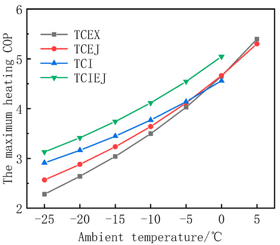 From Figure 12, it can be seen that the maximum heating COP of the four cycles at different ambient temperatures gradually increases with the increase in ambient temperature. Among the four heat pump cycles, TCIEJ has the best system performance and has a large advantage at different ambient temperatures, with a heating COP of 3.13 even at −25 °C. When the ambient temperature is low, TCI benefits from the advantages of vapor injection technology, and the performance is significantly better than TCEJ and TCEX, among which TCEX has the lowest performance. When the ambient temperature is −25 °C, the maximum heating COP of TCI, TCEJ, and TCEX are 2.91, 2.57, and 2.28. With the increase in ambient temperature, the advantages of vapor injection technology in TCI gradually decrease; when the ambient temperature rises to about −2.5 °C, the performance of TCEJ and TCEX gradually exceeds TCI. With the further increase in ambient temperature, the advantages of the expander are more obvious, and the performance of TCEX gradually exceeds TCEJ at about 0 °C.