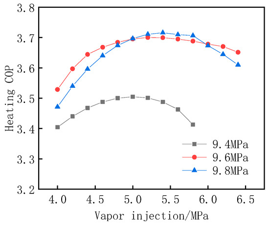 Figure 13 illustrates the trend of the system heating COP with vapor injection pressure under different high pressures. It can be seen from Figure 13 that with the gradual increase in the vapor injection pressure, the system heating COP shows a trend of first increasing and then decreasing. There is an optimal vapor injection pressure that makes the system heating COP the largest, and when the higher the high pressure, the lower the corresponding optimal vapor injection pressure.