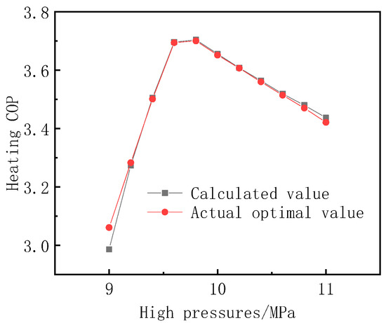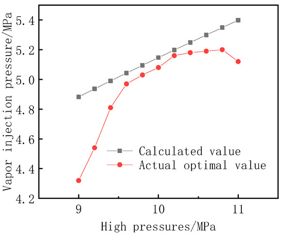 Figure 14 shows the changing trend of vapor injection pressure with high pressure. The calculated value of the system vapor injection pressure is the geometric average of high pressure and evaporation pressure, and the actual optimal value is the actual optimal vapor injection pressure under each high pressure obtained via intermediate pressure iteration. It can be seen from Figure 14 that when the high pressure is high or low, the optimal vapor injection pressure calculated by the formula is quite different from the actual optimal vapor injection pressure. When the high pressure is 9.0 MPa, the calculated value is 13.0% higher than the actual optimal value. It can be seen from Figure 9 that under the given simulation conditions, the optimal high pressure is between 9.6 and 9.8 MPa, and the average gap between the calculated value and the actual optimal value is only about 1.4%.