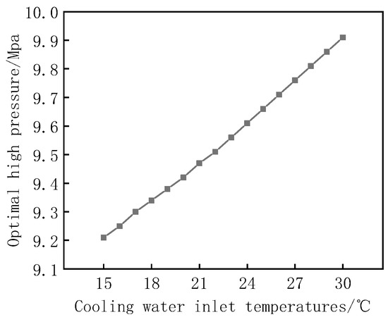 Figure 16 shows the trend of TCIEJ’s optimal high pressure at different cooling water inlet temperatures with cooling water inlet temperatures. It can be seen from the figure that the corresponding optimal high pressure increases as the cooling water inlet temperature increases. This is because the temperature of the cooling water inlet increases, and the outlet temperature of CO2 in the gas cooler continues to rise, resulting in a decrease in the heat release of the gas cooler. In order to meet the temperature demand of domestic hot water, it is necessary to make up for the loss of heat release via a higher compressor exhaust temperature. So, the optimal high pressure continues to increase. When the cooling water inlet temperature increases from 15 °C to 30 °C, the optimal high pressure increases from 9.21 MPa to 9.91 MPa, increasing by about 7.6%.