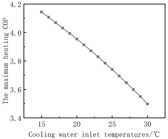 Figure 17 shows the trend of maximum heating COP with cooling water inlet temperature when TCIEJ operates under the optimal high pressure corresponding to different cooling water inlet temperatures. It can be seen from the figure that the maximum heating COP corresponding to each cooling water inlet temperature decreases with the increase in the inlet temperature of the cooling water. This is because the cooling water inlet temperature rises, and the outlet temperature of CO2 in the gas cooler is constantly increased due to the limitation of the heat exchange pinch point, so the maximum heating COP of the system is constantly decreasing. When the cooling water inlet temperature is increased from 15 °C to 30 °C, the maximum heating COP of the system drops from 4.14 to 3.50, which is reduced by about 15.5%. It can be seen that when the cooling water outlet temperature is constant, reducing the cooling water inlet temperature can improve the system performance but, at the same time, increase the power consumption of the system.