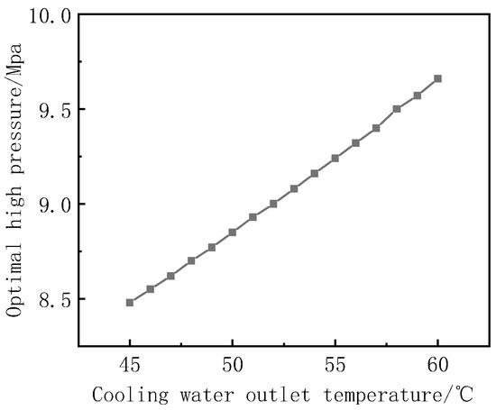 Figure 18 depicts the trend of TCIEJ’s optimal high pressure at different cooling water outlet temperatures as a function of cooling water outlet temperature. It can be seen from Figure 18 that the corresponding optimal high pressure increases as the cooling water outlet temperature increases. When the outlet temperature of the cooling water rises, it is limited by the pinch point and needs to be increased by increasing the compressor exhaust temperature to maintain normal operation, so the optimal high pressure will increase. When the outlet temperature of the cooling water is increased from 45 °C to 60 °C, the optimal high pressure increases from 8.48 MPa to 9.66 MPa, an increase of about 13.69%.