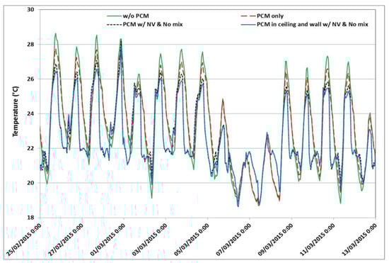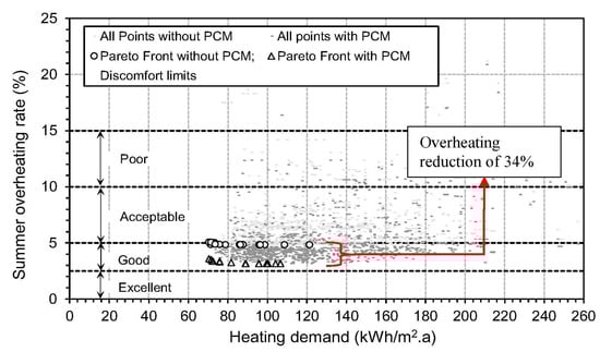 Figueiredo et al. (2017) [35] reported the results of an investigation on interior thermal comfort and energy effectiveness that focused on the positive impact of PCMs when utilised for innovative, new options. The study was conducted in a building with a geothermal system connected to the air conditioning system (Figure 2). The PCM investigation was considered in a number of studies that were conducted in two rooms of a brand-new academic division on the campus of Aveiro, both real and simulated. An evolutionary algorithm and the simulation-based program EnergyPlus® were employed to carry out the numerical analysis. In order to study the prospective and payback time of these unique solutions, constructive solutions were paired with diverse kinds of PCMs with various enthalpies and melting temperatures, as well as different natural ventilation flow rates. The results of the measurements show that persistent discomfort is brought on by the rooms’ interior thermal comfort, specifically overheating. Yet, it was demonstrated that the PCM implication in one of the rooms caused a decrease in overheating by 7.23%, which is equivalent to 35.49% PCM efficiency. Following optimisation, the usage of PCM in one of the rooms resulted in a 34% decrease in overheating, as shown in Figure 3.