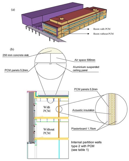 Presentation of the observed rooms and suggestions for improvement: (a) a room with and without and PCM; (b) an example of a suspended ceiling solution and a representative piece of the partition wall [35] (see Table 1).