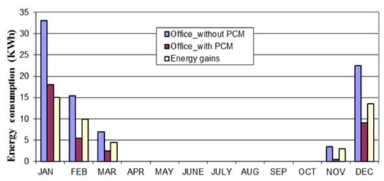 Derradji et al. (2017) [36] used the TRNSYS 17 application to generate a thermal dynamic simulation utilizing type 204 to examine the thermal properties of an office with traditional walls and another office with walls made of PCMs. An Algiers climate simulation was performed on the top floor of an office that was 3.5 m long, 3 m wide, and 3 m high (Algeria). The results showed that the temperature of the office rose between 3 and 4 °C during the winter as a consequence of the installation of PCMs in the concrete ceiling and hollow brick walls. The results also showed that by reducing the interior air temperature to 7 °C, the PCMs in the walls minimised summertime overheating. The office with PCM needs 18 kWh to heat in January as compared to the 33 kWh requirement of the office without PCM, as depicted in Figure 4.