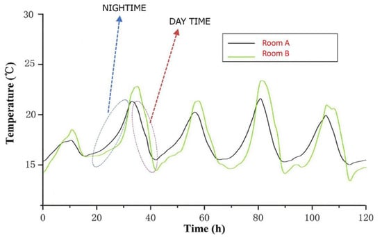 Winter case and temperature comparison between Room A (without PCM) and Room B (with PCM) inside [37].