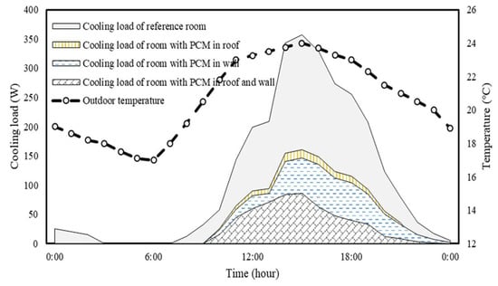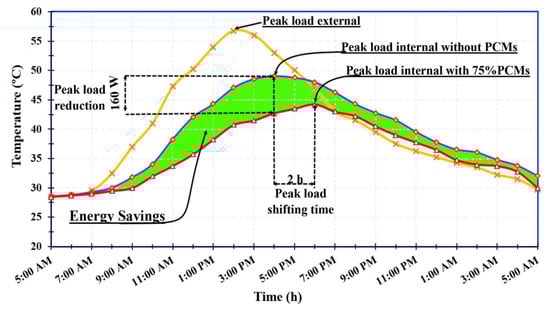 Peak-load alterations and reductions in the room with and without PCMs [51].