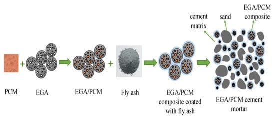 Recycled expanded glass aggregate (EGA) was used by Yousefi et al. (2021) [52] to manufacture form-stable PCM composites (Figure 8). The leakage information from the diffusion-oozing circle test and the EGA’s high absorption ratio of 80% both validated the sustainability of the synthesised composite. The results of the thermogravimetric analysis indicated that the composite had a high degree of thermal stability. Moreover, thermal performance analyses revealed that using EGA-PCM could meaningfully decrease the heat transfer rate of the cement mortar by as much as 47%. The EGA-PCM composites are eventually more advantageous from an environmental aspect despite their high cost of production and initial installation.