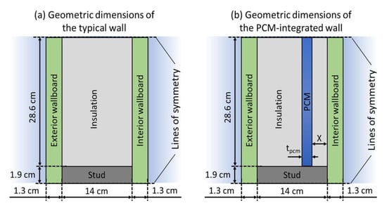 The main dimensions of the (a) normal building wall and the (b) PCM-integrated wall are shown in the two-dimensional geometries of the lightweight building walls [60]. (X is the thickness of the insulation from the interior side.)