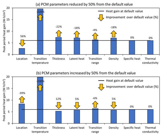 Analysis of the sensitivity of several PCM settings as corresponding to the peak period heat gain in Las Vegas and impacts on peak heat gain owing to (a) a 50% drop in default PCM parameter values and (b) a 50% increase in default PCM parameter values [60].