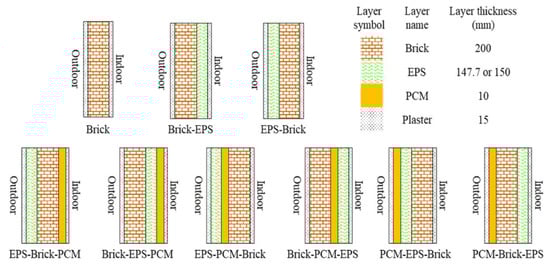 Schematics for various wall designs. The layers (Brick, EPS, and PCM) are arranged from outside to inside [61].