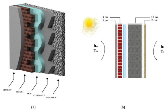 The building envelope’s planned structure, (a) layer kinds, and (b) 2D configuration with dimensions [63].
