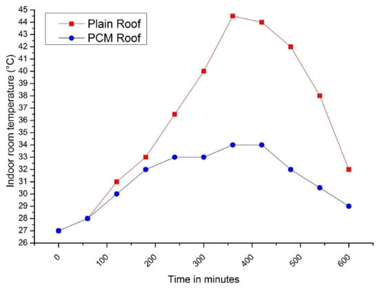 Boobalakrishnan et al. (2021) [64] made an effort to lessen the entire cooling load of a building, which may alleviate a significant amount of the demand for conventional electricity. In order to conduct the study, a scale model of the projected structure was constructed and evaluated. The studies were carried out in two different ways: in the first instance, there was no PCM in the roof (also known as a “Plain Roof”), and in the second case, there was encapsulated paraffin serving as the PCM inside the roof. The outcomes of the tests stated that the incorporation of PCM into the metal roof of the one-story structure triggered a significant lessening in the temperatures of the building’s inner roof and outer roof, and thus in the interior space of the building. Figure 15 shows that the deployment of PCM has resulted in a reduction of 9.5 °C in the highest temperature that could be reached inside and a daily average decrease of 5 °C in the lowest temperature.
