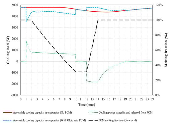 Rai (2021) [61] examined the energy efficiency of PCM-incorporated brick masonry walls for cooling load management in inhabited structures in intervallic steady-state situations in order to classify the factors that affect its actions and improve simple design strategies. The outcomes are displayed in Figure 12. The study found that cooling loads and daily heat gains were the same for wall designs with matching thermal resistances and identical boundary circumstances, independent of the amount of latent heat stored by the PCM. Likewise, even when night ventilation was used, adding a PCM layer to a wall that was sufficiently insulated did not reduce its cooling demand. As a result, the PCM incorporation was useless in lowering the cooling load. Nonetheless, the hourly heat gains and fluctuations in cooling demands were diminished by the PCM’s latent heat storage, making PCM integration appropriate for peak load control. For optimum PCM performance, the PCM should be installed inside a wall with adequate insulation to shield it from the outdoors and a melting temperature that is almost the same as the interior set-point temperature.