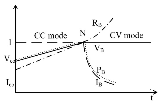 Figure 2 shows the two sequential modes of EV battery charging, such as Constant Current (CC) and Constant Voltage (CV). Here, IB, VB, RB, and PB are assigned for battery current, voltage, resistance, and power, respectively. Battery resistance is defined as the ratio of battery voltage and current. Along with this, Ico and Vco are the cutoff current and voltage, and N is the point of transition from CC to CV mode. For the sake of keeping the study simple, an assumption is made that the battery voltage in CC mode is in a linear charging profile. All the parameters in Figure 2, such as current, voltage, resistance, and power, are normalized. The normalization is carried out as follows: (i) current is normalized to the CC mode current ICC; (ii) voltage is normalized to the maximum battery voltage VM; (iii) resistance is normalized to the resistance at point N, equal to the ratio of VM and ICC and is denoted by RN; and (iv) power is normalized to the power at point N, given by the product of VM and ICC and is denoted as PN. It is observed that the battery resistance in CC mode increased from Rl, which is the ratio of voltage and current at the beginning of CC mode, to RF, which is the ratio of VM and ICO through RN. Also, battery power increases from PI to PN and then decreases to PF. Resistance RB as a function of PB, in CC and CV modes, is represented as