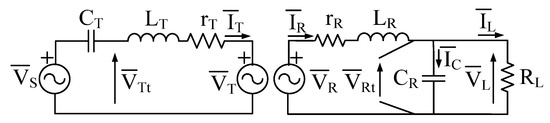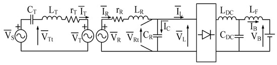 Figure 3 shows the series–parallel topology for the WBC system. The symbols in Figure 3 are assigned as follows: (i) is the power source voltage; (ii) and are the transmitter and receiver side currents; (iii) CT and CR are the transmitter and receiver resonant capacitors; (iv) and are the transmitter and receiver coils terminal voltages; (v) LT and LR are the transmitter and receiver coils inductances; (vi) rT and rR are the transmitter and receiver coils parasitic resistances; (vii) and are the voltage induced in the transmitter and receiver coils due to the effect of mutual inductance; (viii) and are the receiver-side capacitor current and load current; and (ix) RL and are the load resistance and voltage across RL. The induced voltages and are given by