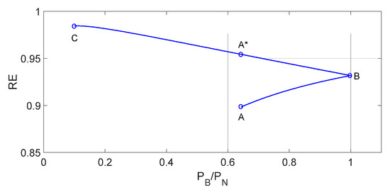 Figure 7, Figure 8 and Figure 9 plot the PTR, RE, and efficiency with respect to the PB normalized to PN. In these plots, curves ABA*C belong to arrangement #1, and curves A*BC belong to arrangement #2. The simulation has been carried out in the MATLAB/Simulink environment. The FOMs expressions are extracted as in (19)–(21), where the value of RL has been chosen as (34) and (37) for arrangement #1 and arrangement #2, respectively.