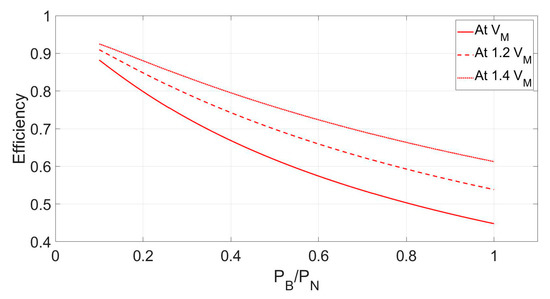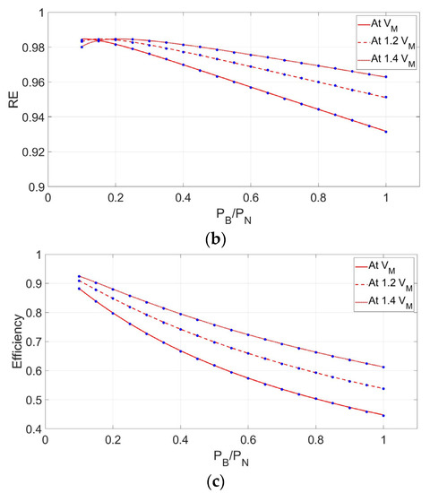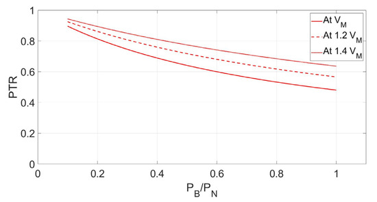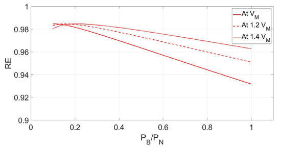 In order to select a convenient chopper input voltage VDC for arrangement #2, PTR, RE, and efficiency are investigated for three different values of VDC as VM, 1.2 VM, and 1.4 VM. Figure 10, Figure 11 and Figure 12 plot the PTR, RE, and efficiency with respect to the PB normalized to PN by MATLAB/Simulation.