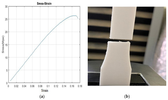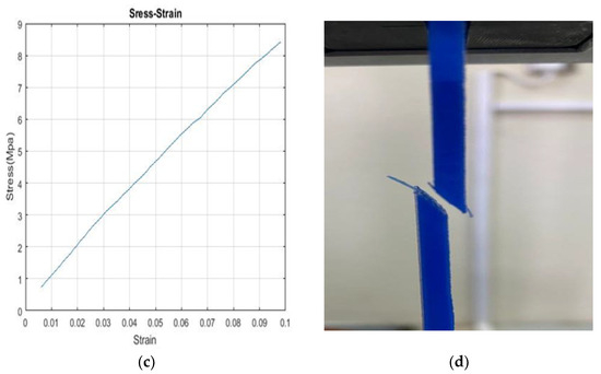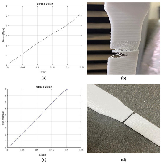 Mechanical properties of the 3D-printed specimen: (a) stress–strain profile for PETG 15°, (b) photograph of a failed 3D-printed PETG 15° specimen sample, (c) stress–strain profile for PETG 30°, and (d) photograph of a failed 3D-printed PETG 30° specimen.