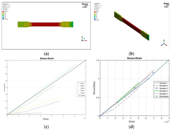 (a) Simulation for PLA, (b) simulation for PLA (3D), (c) stress–strain results chart of PLA−15° experimental/simulation, and (d) stress–strain results chart of PLA−30° experimental/simulation.