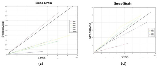 Figure 4 presents the experimental curves for each sample, which closely aligned with the simulation curves associated with their respective printing angles. This close match between the experimental and simulated responses allowed one to obtain a clear understanding of how different printing angles affected the mechanical properties of the samples. Notably, a significant difference was observed when the printing angle was varied.