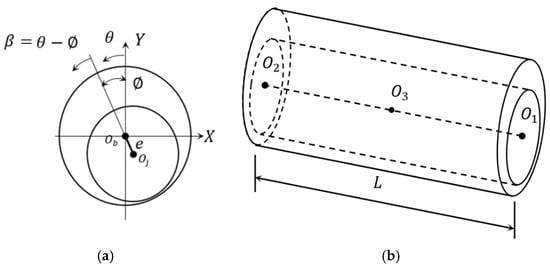 Figure 1 shows a perfectly aligned journal bearing where the shaft axis is parallel to the bearing axis. In such an ideal case, the resulting gap (lubricant layer thickness) between the shaft surface and the bush inner surface is given by Equation (1), and the general solution is governed by the well-known Reynolds equation (Equation (2)) [,].