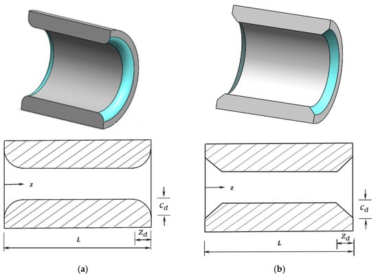 The presence of misalignment causes a severe reduction in the layer thickness of the lubricant at the edges of the bearing, as explained previously. This is due to the resulting slope of the shaft in comparison with the axis of the bearing. The thinning of the gap between the surface of the shaft and the inner surface of the bearing can be overcome to an acceptable level by modifying the design of the bearing profile over the positions where the misalignment causes the most drop in the levels of the lubricant layer thickness. This work considers two types of profile modification, which are the curved modification and the linear modification. In the former type, the bearing profile’s slope continues at the modification’s start position, which requires at least a second-order curve, while this is not the case in the latter type (linear). These two design forms are shown in Figure 3. Figure 3a shows the curved type, and Figure 3b illustrates the linear type of modification. In both forms, the modification is performed over a distance along the bearing width from both sides and over a distance in the radial direction.