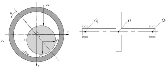 Determining the pressure derivatives involves a numerical discretization of Equations (23)–(26) to calculate the eight dynamic coefficients. The determination of the dynamic response of the journal to position perturbation is performed after calculating the previously mentioned eight dynamic coefficients. Figure 4 illustrates a schematic drawing of a rotor–bearing system where the equations of motion of this system can be written as follows [].
