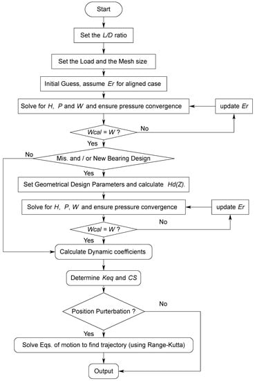 At this step, the solution of the whole equations is performed based on a pressure convergence criterion of . After determining the pressure field, the supported load is determined using numerical integration, and the resulting load is compared with the applied real load with an accuracy of . If this calculated load is not within this limit, is manipulated, and the whole process of calculating a new pressure field and film thickness is repeated. After obtaining the pressure and the load convergences, the 4th-order Runge–Kutta method is used to solve the equations of motion to determine the system’s dynamic response. Figure 5 shows a flowchart of the solution steps.