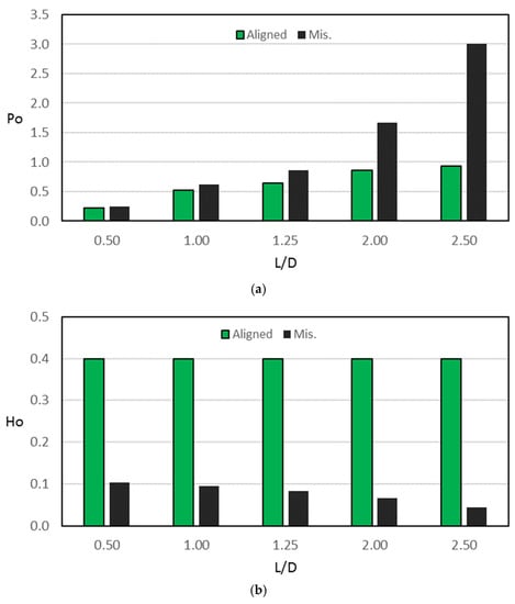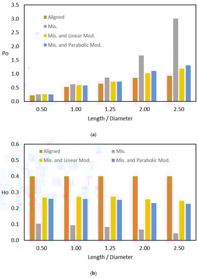 Figure 7 illustrates the effects of the 3D misalignment for a wide range of Length/Diameter ratios () on the dimensionless maximum pressure () and the dimensionless minimum film thickness () when the eccentricity ratio ( is 0.6, and the misalignment parameters are . It is well known that, in the case of a perfectly aligned journal bearing, increasing the ratio ( for the same increases the resulting maximum pressure, as seen in the green bars shown in Figure 7a. The values of are 0.227, 0.529, 0.644, 0.858, and 0.928 when the ratios are 0.5, 1.0, 1.25, 2.0, and 2.5, respectively. This means, in other words, that changing the ratio from 0.5 to 2.5 for the same eccentricity ratio increases the dimensionless maximum pressure more than three times. The presence of misalignment, which is practically difficult to avoid, increases the maximum pressure values for the whole considered range of ratios, which is illustrated by the black bars in Figure 7a. This increase in the maximum pressure value is more noticeable at the higher ratios. The percentage increases due to the presence of 3D misalignment are 10.5%, 17.1%, 34.2%, 94.1%, and 224.4% for the previously mentioned range of ratios, respectively. Therefore, it is important to avoid higher values of ratios. On the other hand, Figure 7b shows the corresponding misalignment effect on the dimensionless minimum film thickness for the considered range of ratios. In the ideal case of journal bearing, using an eccentricity ratio of 0.6 for the whole range of ratio results in the same dimensionless minimum film thickness values. This is obvious from Equation of the film thickness (), which results in a minimum value of 0.4 when , regardless of the ratio. This value (0.4) can be seen by the green bars in Figure 7b. The 3D misalignment reduces the values of significantly in the whole range of ratio, as illustrated by the black bars in this figure. The reduction is 74.4%, 76.4%, 79.3%, 83.4% and 89.3% when are 0.5, 1.0, 1.25, 2.0, and 2.5, respectively. Such a reduction in the minimum film thickness, which is much less than the designed value, will negatively affect the system’s performance and life. One of the solutions is reducing the supported load value by the journal bearing to elevate the minimum film thickness, but this is not a practical solution. This work will show later how changing the design of the bearing profile will improve the bearing performance with regard to the levels of pressure, film thickness and many other related factors.