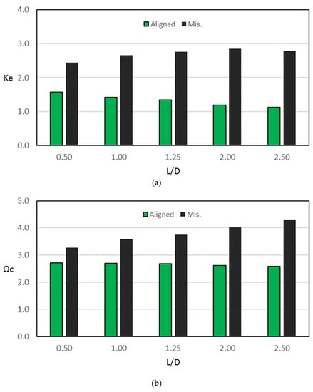 The misalignment also affects the dynamic features of the system. Figure 8 shows the misalignment effects for a wide range of Length/Diameter ratios on the dimensionless equivalent stiffness and the dimensionless critical speed when and the 3D misalignment parameters are . It can be seen that (Figure 8a), the equivalent stiffness coefficient () increases by 55.4%, 87.1%, 104.4%, 139.6%, and 147.5% when L/D is 0.5, 1.0, 1.25, 2.0, and 2.5, respectively. These increases in the equivalent stiffness raise the corresponding dimensionless critical speed by 20.5%, 33.0%, 39.7%, 53.3%, and 66.3%, respectively. The improvement in the critical speed of the rotor–bearing system due to the 3D misalignment for the whole range of ratio comes at the price of the reduction in the static characteristics of the considered system, as mentioned previously (Figure 7) in terms of the sharp increase in the maximum pressure and the significant drop in the minimum film thickness. However, changing the bearing profile design parameters will be shown later to be an excellent compromise in terms of maintaining a relatively thick film of lubricant and lowering the maximum pressure without losing a significant part of the enhancement in the dynamic characteristics of the considered system.