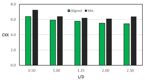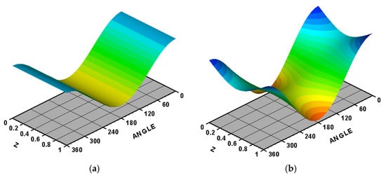 More details about the consequence of the 3D misalignment on the dynamic coefficients of the considered system are shown in Figure 9 and Figure 10. Figure 9 shows the misalignment effects on the four dimensionless stiffness coefficients (, , and ), while Figure 10 illustrates the corresponding effects on the four dimensionless damping coefficients (, and ). In all cases (the full range), the presence of the 3D misalignment changes all the dynamic coefficients, so the critical speed was changed. It is worth mentioning that the coefficient of stiffness is the first responsible for journal bearing stability. The negative values for this coefficient lead to instability problems, while the positive values result in stable operation of the journal bearing [].