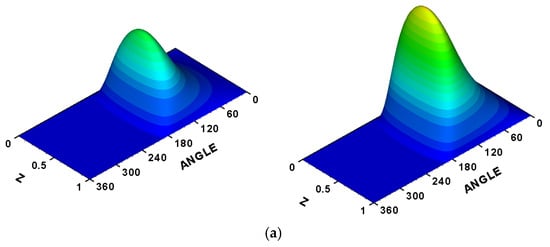 The effects of modification on the 3D pressure distribution and film thickness are better illustrated in Figure 12 and Figure 13. Figure 12 shows the 3D pressure distribution when (left) and 2.0 (right), and similar behavior is obtained for the other ratios. Therefore, they are not shown here. Figure 12a shows the pressure distribution of the ideal case. In this case, the pressure distribution is uniform (aligned) and symmetric about the line of . Figure 12b shows the pressure distribution when the system operates under the 3D misalignment, where it is no longer symmetric about the line of , and pressure spikes appear. These spikes correspond to the positions where the film thickness reduces significantly due to misalignment. Introducing the profile modification reduces these pressure spikes, and the pressure distribution becomes closer to that of the aligned case, particularly at the lower ratio, as shown in Figure 12c, where the curved modification is only shown in this figure as the almost similar shape is obtained for the linear modification. The corresponding film thickness distributions are shown in Figure 13 for the case of , as similar behavior is obtained for the other ratios. Figure 13a shows the film thickness distribution for the perfect case (without misalignment), where the distribution is uniform and extruded in constant values over the length . However, this perfect case seldom exists in the practical uses of journal bearings. The effect of misalignment on the film thickness is shown in Figure 13b, where the distribution is no longer uniform and shows red zones (minimum values) at the bearing edges. The effects of linear and curved modifications on the film thickness distribution are shown in Figure 13c and Figure 13d, respectively. The film thickness is elevated at the edges due to these modifications. The curved modification shows a more uniform distribution as the slope continuity is maintained at the start of modification in contrast with the linear modification, where the sudden change in the profile is obvious in Figure 13c. This sudden change might lead to stress concentration, and an elastohydrodynamic solution is required to assess the linear modification more accurately. However, this is not the case in the curved modification, as explained previously.